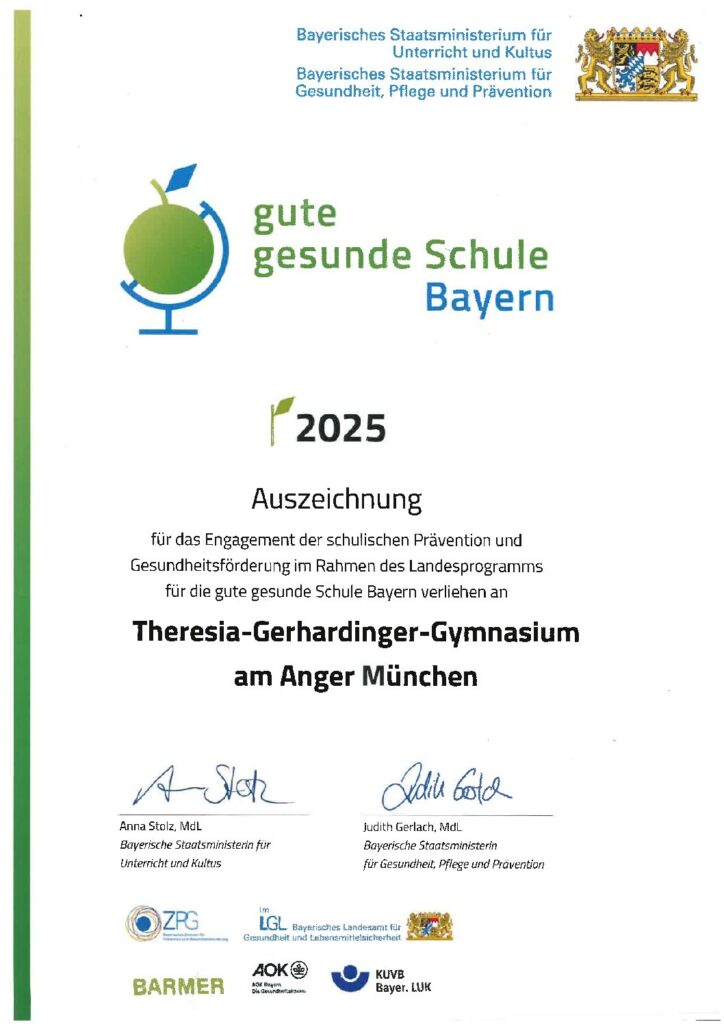 „Gesund und stark durch den Schulalltag und das Leben gehen“ diesem Motto der „guten gesunden Schule“ sind auch wir mit unserer Teilnahme am Landeswettbewerb gefolgt und wurden für unsere beiden eingereichten Projekte zu den Themen „Gesunde Ernährung“ und „Bewegung im Schulalltag“ vom Bayerischen Staatsministerium für Unterricht und Kultus und vom Bayerischen Staatsministerium für Gesundheit, Pflege und Prävention ausgezeichnet. Seit diesem Schuljahr dürfen wir uns daher als „gute gesunde Schule“ bezeichnen und das entsprechende Siegel tragen.